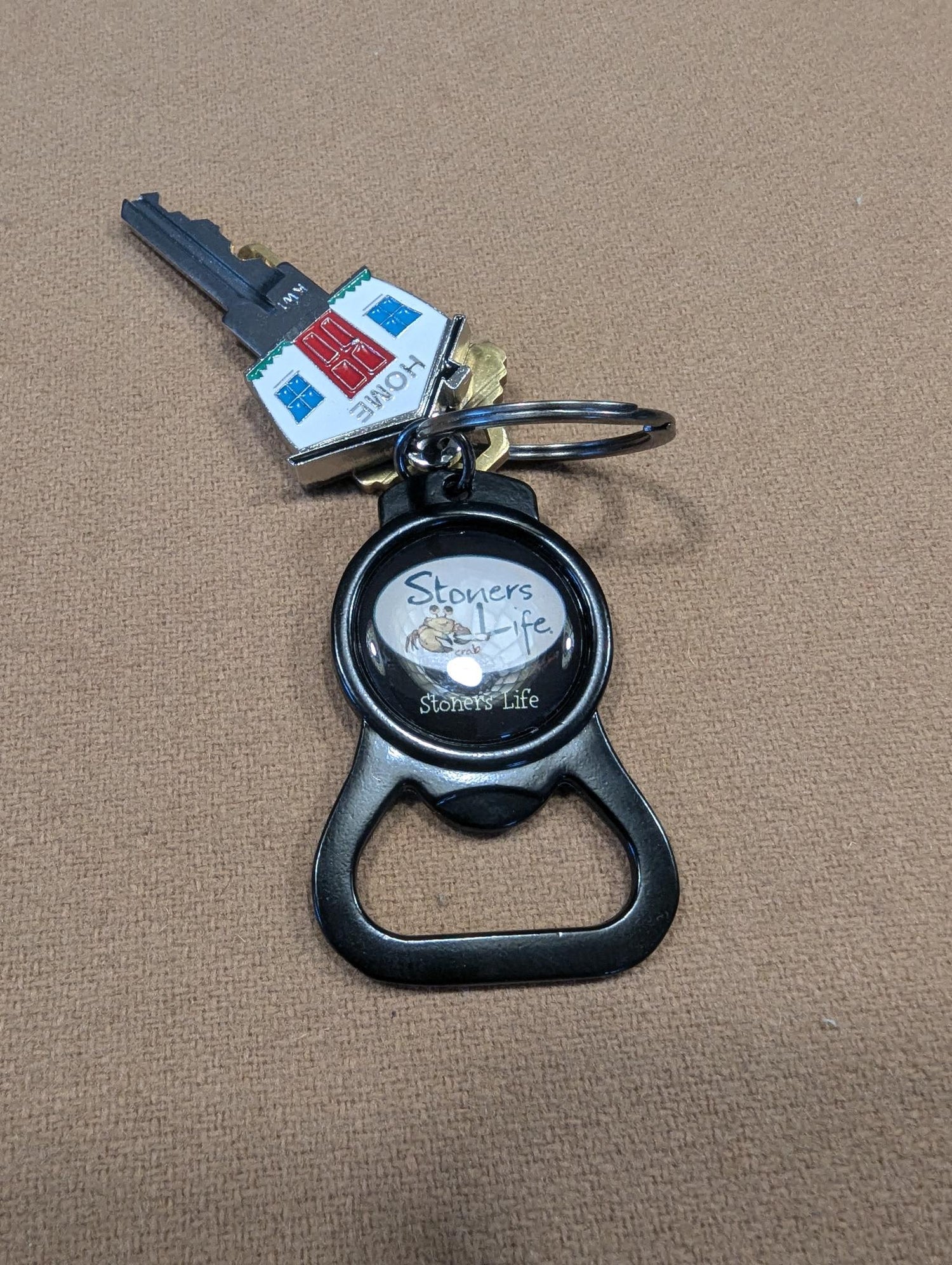 Durable metal keychain featuring the fun “Stoners Life” logo and a built-in bottle opener — perfect for everyday carry or casual hangouts.